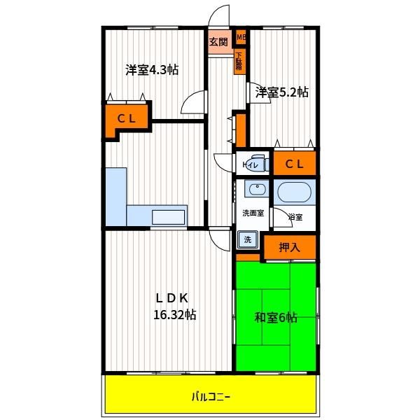 | 築年月 | 1994年3月 | 間取り | 3LDK( 洋室5.2畳/洋室4.3畳/和室6畳/LDK16畳 ) | 専有面積 | 69.19m2 |