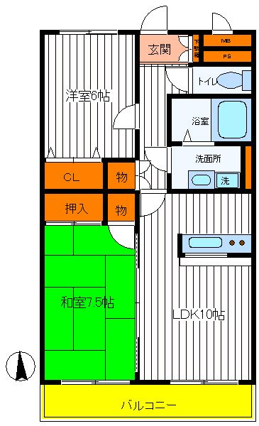 築年月 2000年7月  間取り 2LDK( 洋室6畳/和室7.5畳/LDK10畳 ) 専有面積 56.44m2
